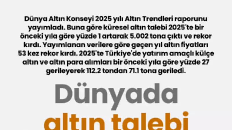 Dünya Altın Konseyi tarafından yayımlanan 2025 yılı Altın Trendleri raporu, küresel altın piyasasındaki önemli gelişmeleri ortaya koydu. Rapora göre, dünya genelinde altın talebi bir önceki yıla kıyasla yüzde 1 oranında artış göstererek 5.002 tona ulaştı ve bu rakamla tarihi bir rekor kırıldı.