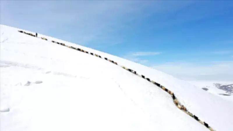 Ağrı'nın yüksek rakımlı mezralarında yaşayan besiciler, küçükbaş hayvanlarını karla kaplı dağlar arasında "tek sıra" halinde beslenme alanlarına götürerek zorlu bir mücadele veriyor. Kışın çetin geçtiği bölgede, mart ayının sonuna gelinmesine rağmen dağlar ve tepeler hala beyaz örtüyle kaplı durumda.