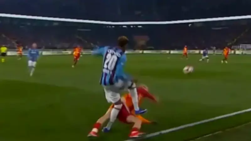 Galatasaray'ın genç yıldızı Barış Alper Yılmaz, Trabzonsporlu Wagner Pina'ya yaptığı sert müdahale nedeniyle hakem Cihan Aydın tarafından sarı kartla cezalandırıldı. Ancak pozisyonun şiddeti VAR ekibinin dikkatini çekti ve hakeme inceleme için uyarı geldi.